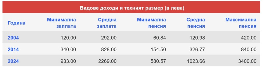 Най-голямо е нарастването при оптималната пенсия, която бележи растеж от 2980 лв., до момента в който междинната работна заплата нараства с 1977 лв.. Не по-малко впечатляващо е покачването на минималната работна заплата с 813 лв., а междинната пенсия за застрахователен стаж и възраст се е нараснала с 902,68 лв. за същия интервал.