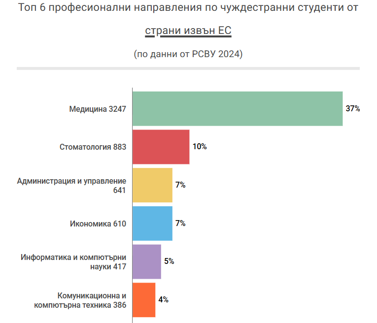 Всеки двама от трима задгранични студенти от Европейски Съюз, които идват у нас, желаят да станат лекари. Медицината е безспорен любимец с съвсем 4 500 непознати студенти.