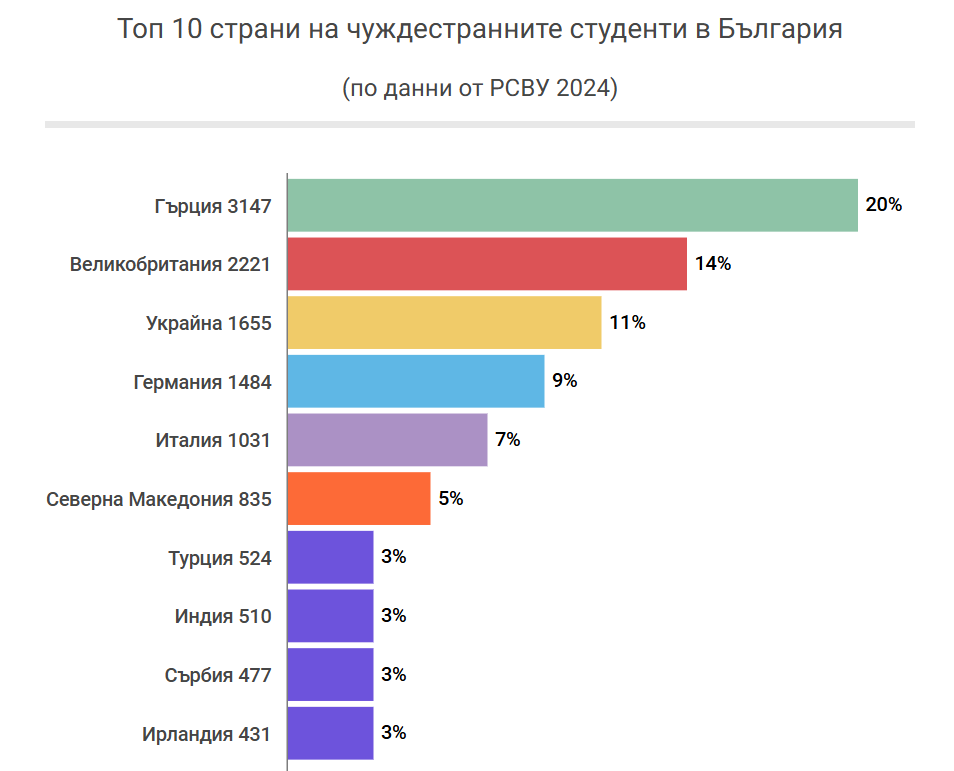 Да учат в България избират най-вече студенти от Гърция (20%), на второ място са непознатите студенти от Англия (14%), а на трето място - от Украйна (11%).