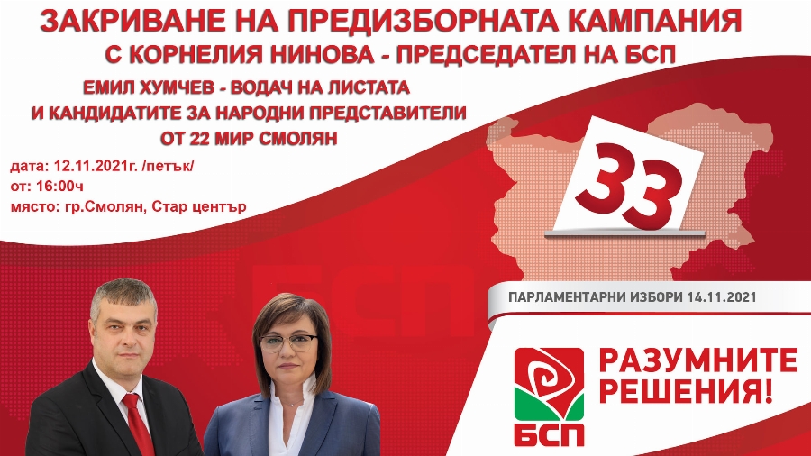 (Плакатът на " Българска социалистическа партия за България " за закриването на каманията в Смолян - Емил Хумчев с Корнелия Нинова)