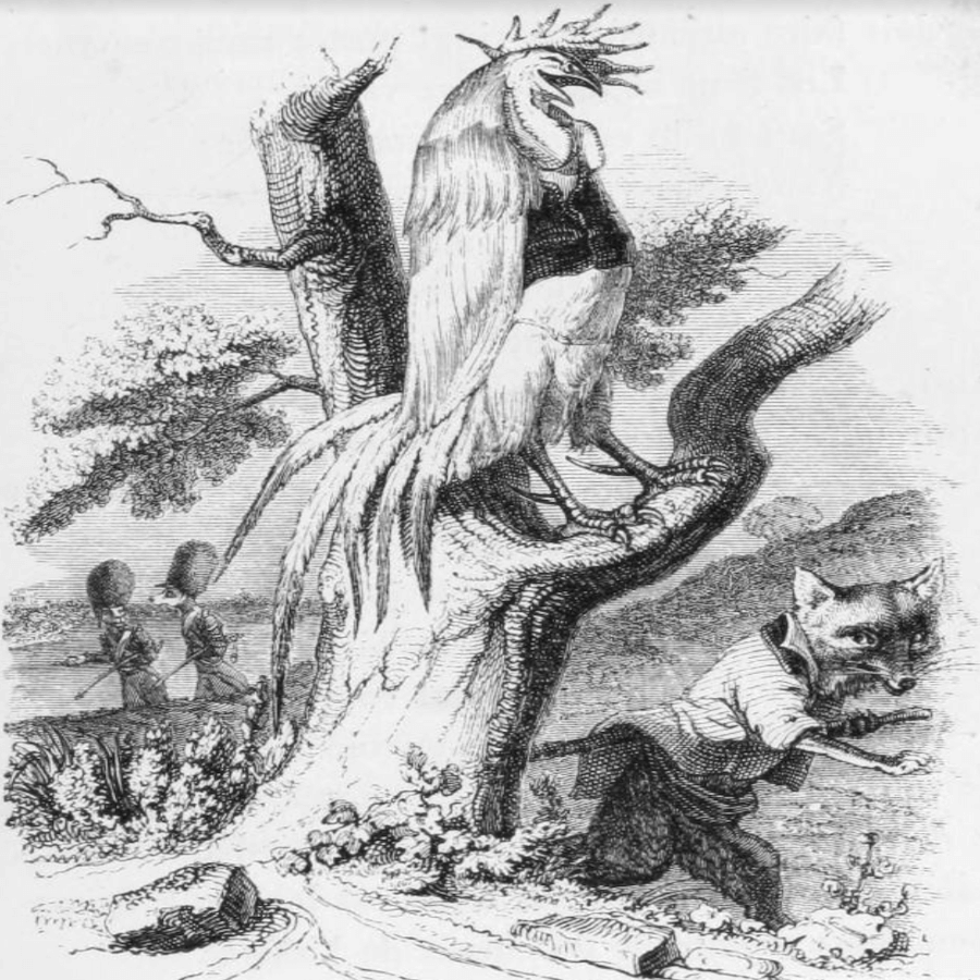 Илюстрация на френския карикатурист Жан Игнас Изидор Жерар Гранвил (1837 - 1838) към баснята на Лафонтен „ Петелът и лисицата “