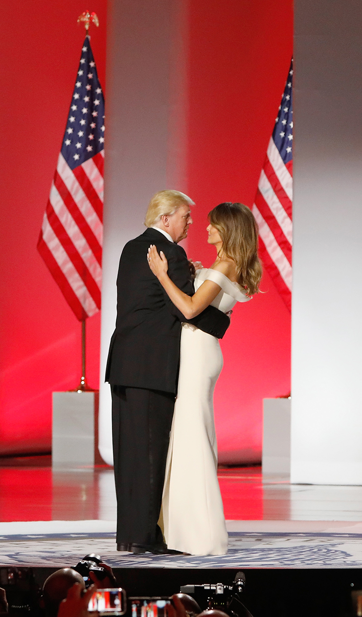 Появиха се и шегобийци, които съпоставиха аутфита на първата дама с роклите на френския тим от Тримагическия шампионат от четвъртия филм за Хари Потър. Каквото и да приказват хората или таблоидите, Мелания Тръмп съблюдава елегантната традиция на дамите преди нея. Силуетът ни връща обратно и припомня за Джаки Кенеди. Косите бяха събрани в свободен, обемен кок, а цялостната визия приключена от ръкавици до лакътя, клъч и семпли обувки на ток в същия звук.За последвалия бал и обичайния танц на президента и първата дама, Мелания заложи на изискана бяла рокля с паднало рамо, като самата тя имаше принос в основаването й. Задачата беше изпълнена от дизайнера Ерве Пиер, някогашен изобретателен шеф на Каролина Ерера.