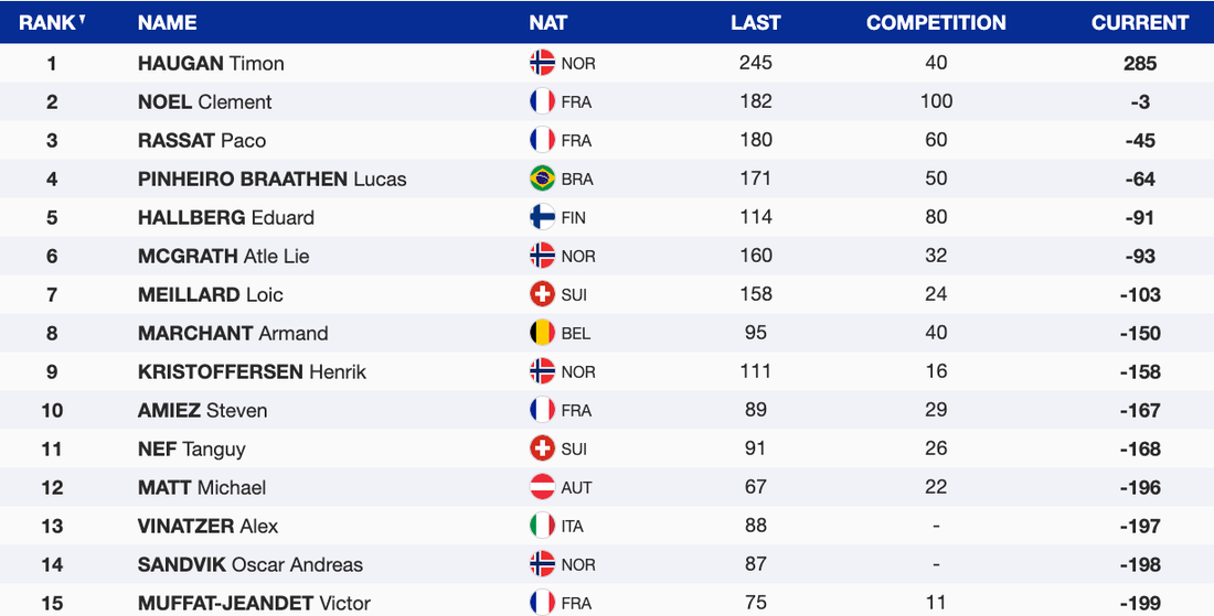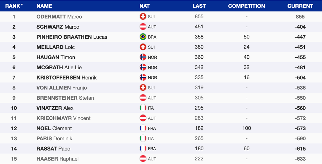 В генералното класиране за Световната купа надалеч пред всички продължава да е Марко Одермат (Швейцария), който с 855 точки води с цели 404 пред Марко Шварц (Австрия), който не съумя да се класира за втория манш през днешния ден. Трети на 447 пункта зад водача е Пинейро Бротен, а с успеха си през днешния ден Ноел се изкачва на 12-ото място с пасив от 573 точки. Алберт Попов е 66-ти с 57 точки на своята сметка.