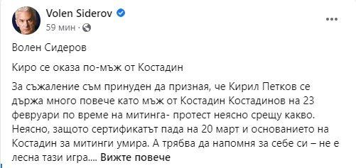 За страдание съм заставен да призная, че Кирил Петков се държа доста повече като мъж от Костадин Костадинов на 23 февруари по време на митинга-протест неразбираемо защо, написа в коментар във фейсбук водачът на " Атака " Волен Сидеров.