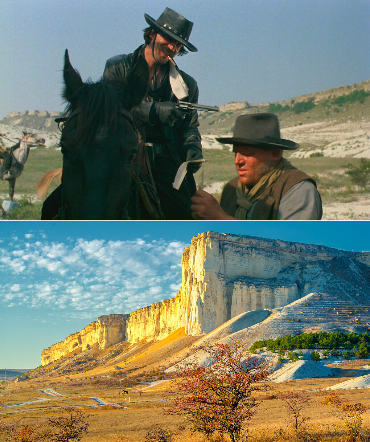 Алла Сурикова/“Мосфилм“, 1987; Александър Прокопенко (CC BY-SA 4.0) Провинциалният град Санта Каролина в Дивия запад „израства“ в Крим по време на фотосите на „Човекът от бул. Капуцини“ (1987). Не става и дума за каквито и да било командировка в Съединени американски щати и основателите на кино лентата търсят подобаваща природа в рамките на Съветския съюз. Крим е съвършен вид: локалната природа в действителност наподобява на прериите на американския Див запад, а разнообразието от пейзажи разрешава материалът да се снима по този начин, като че ли е изработен на разнообразни места.