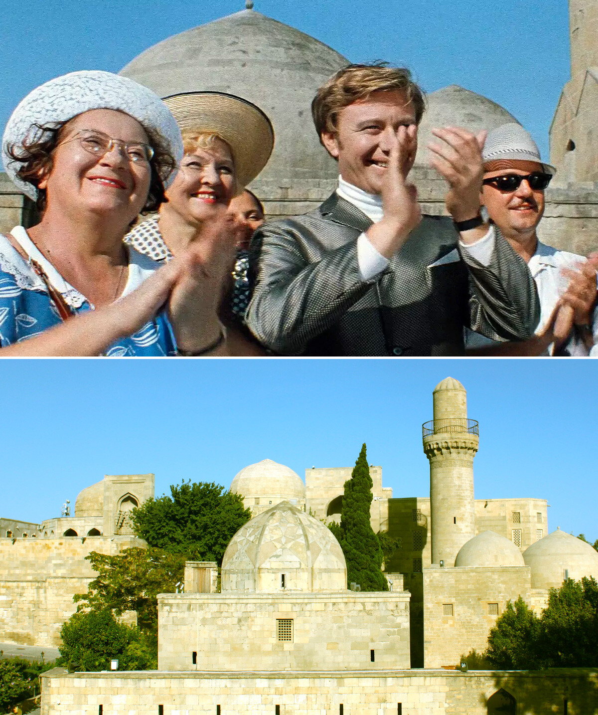 Леонид Гайдай/“Мосфилм“, 1969; Урек Мениашвили (CC BY-SA 3.0) В руския филм „Диамантената ръка“ (1969) сцените от Истанбул се снимат в Баку, тъй като снимачната група не е пусната в Турция. Главната локация в Азербайджанската република е старинният квартал Ичери-Шехер и неговите забележителности: дворецът Ширваншахов, джамията Джума и Девичата кула. Пак там, с цел да се пресъздаде околната среда, са окачени табели на разнообразни езици, в това число и на фарси, което няма нищо общо с Истанбул. Това обаче основава усещането, че действието на кино лентата се развива в чужбина.