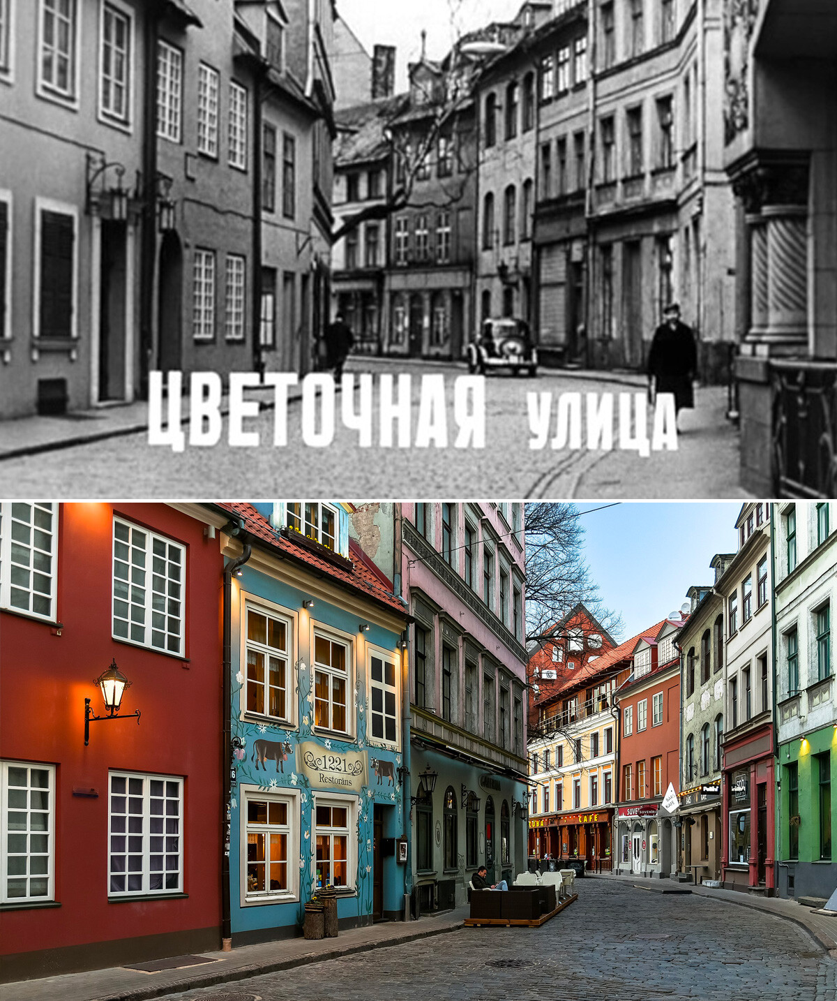 Татяна Лиознова/Киностудио „М. Горки“, 1971-1973; Jorge Franganillo (CC BY 2.0) Шпионската драма „Седемнадесет мига от пролетта“ (1971-1973) за руски шпионин, който е внедрен във висшите ешелони на властта в нацистка Германия, отчасти е сниман в Германска демократична република. Само че сцените в Берлин се снимат в обичаната на руските режисьори Рига. А най-много улица „Яуниела“, която съгласно сюжета е „Блуменщрасе“.