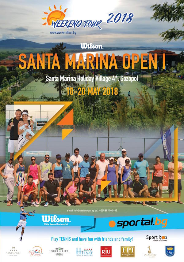 За шеста поредна година фамилната тенис и СПА верига Weekend Tour ще гостува във ваканционно населено място Санта Марина Созопол. От 18 до 20 май Санта Марина Оупън 2018 ще предложи на приятелите на спорта същинско морско премеждие. Това е вторият шампионат за годината на Weekend Tour и ще събере дилетанти от цяла България, дружно с техните близки и другари. Както нормално, всички посетители на курортния комплекс ще могат да играят доста тенис на най-хубавите хард кортове в България, да създадат първите си слънчеви бани на брега на морето и всичко това – при съвършени условия в „ Санта Марина “.