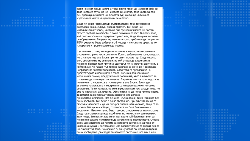 От писмото на сина излиза наяве и друго. Баща му първо е признат в болничното заведение за 5 дни, след което е изписан в още по-влошено положение. Лекарите желали първо да излезе решението на съда за наложително лекуване. Съдът, обаче, назначил делото 2 месеца по-късно. През което време, положението на мъжа се задълбочило още повече.