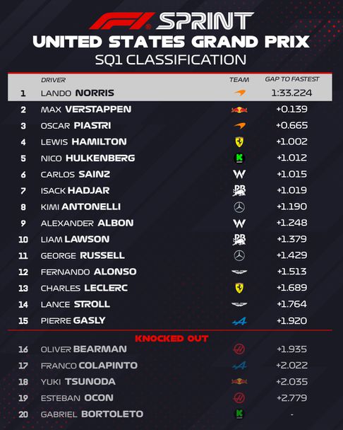 Пиастри изостана с цели 0.380 от първото място и ще започва трети, а до него на втората редица ще се подреди Нико Хюлкенберг, който записа своята най-силна подготовка въобще от началото на сезона. Пети остана Джордж Ръсел, който ще раздели третата редица с Фернандо Алонсо, а зад тях топ 10 на стартовата решетка ще оформят Карлос Сайнц, Люис Хамилтън, Алекс Албон и миналогодишният победител в Гран При на Съединени американски щати Шарл Леклер.