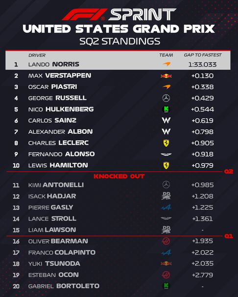 Първи отвън топ 10 на стартовата решетка в спринта ще бъде Андреа Кими Антонели, който в самия завършек на втората фаза на квалификацията беше изпреварен с 0.006 от своя предходник Хамилтън, който взе последния билет за SQ3. Заедно с Антонели навън след SQ2 бяха Исак Хаджар, Пиер Гасли, Ланс Строл и Лиам Лоусън, който остана без време, откакто единствената му летяща обиколка беше изтрита поради излизане от пистата в предпоследния завой. Дори и с нея новозеландецът нямаше да продължи напред в квалификацията, защото тя щеше да му е задоволителна единствено за 14-тото място.