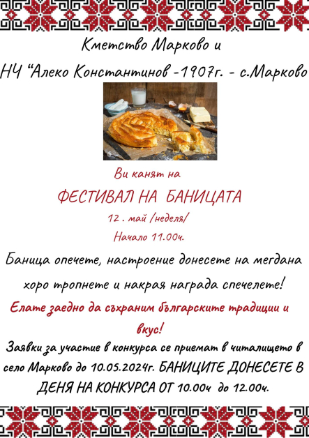 За трета поредна година село Марково ще е хазаин на извънредно вкусния и атрактивен фестивал на баницата. Майстори на кулинарното прелъщение, обичайно за българската софра ще покажат по най - атрактивния метод приготвянето на баницата пред жителите и гостите на община Родопи.