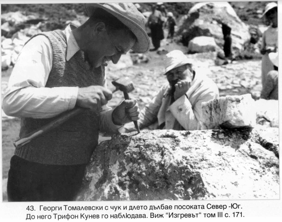 Снимка: Георги Томалевски с чук и длето дълбае посоката Север - Юг. До него Трифон Кунев го следи, beinsaduno.bg