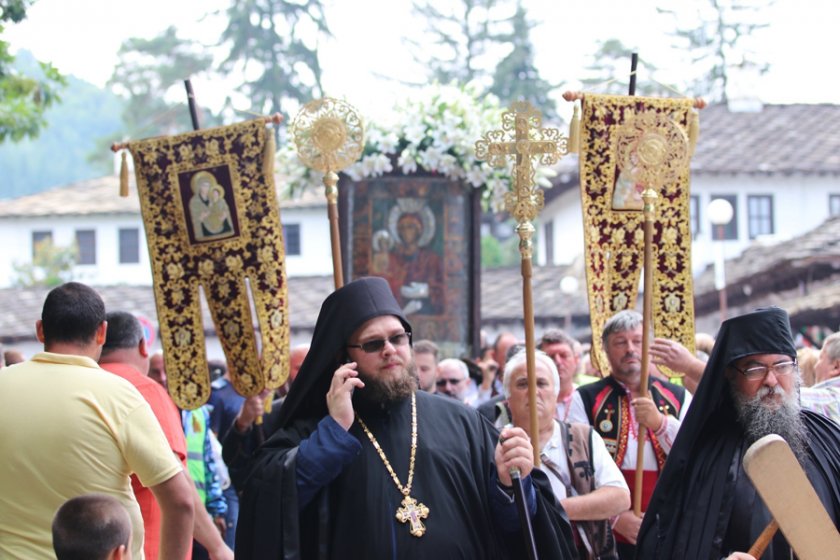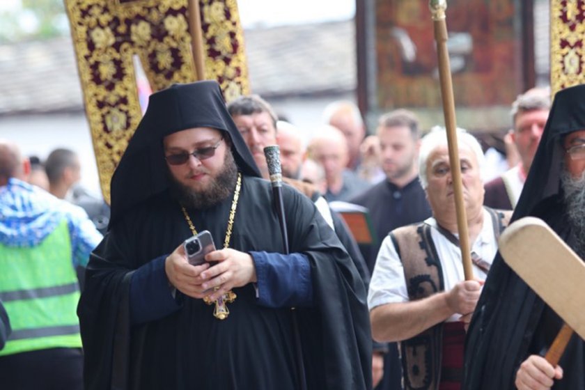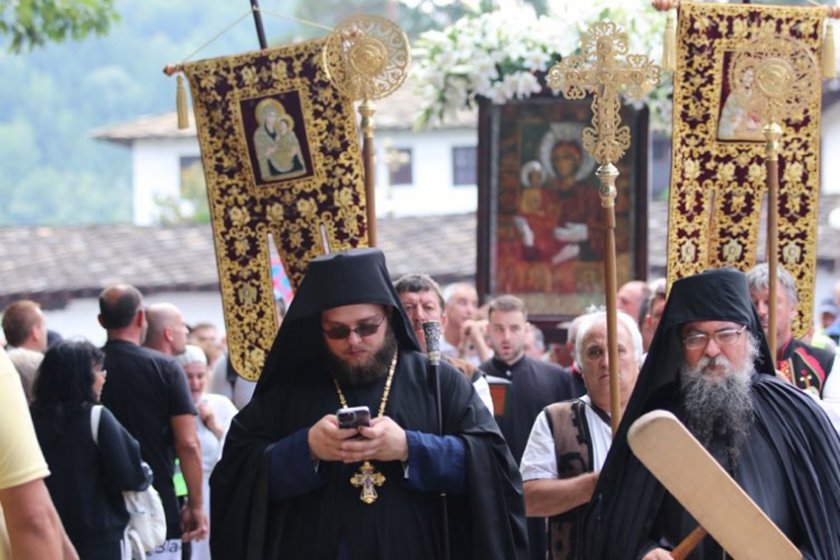 Това изясни пред медии йеромонах Стефан от Троянския манастир, минути преди да се заеме с мобилния си телефон отпред на литийното шествие.