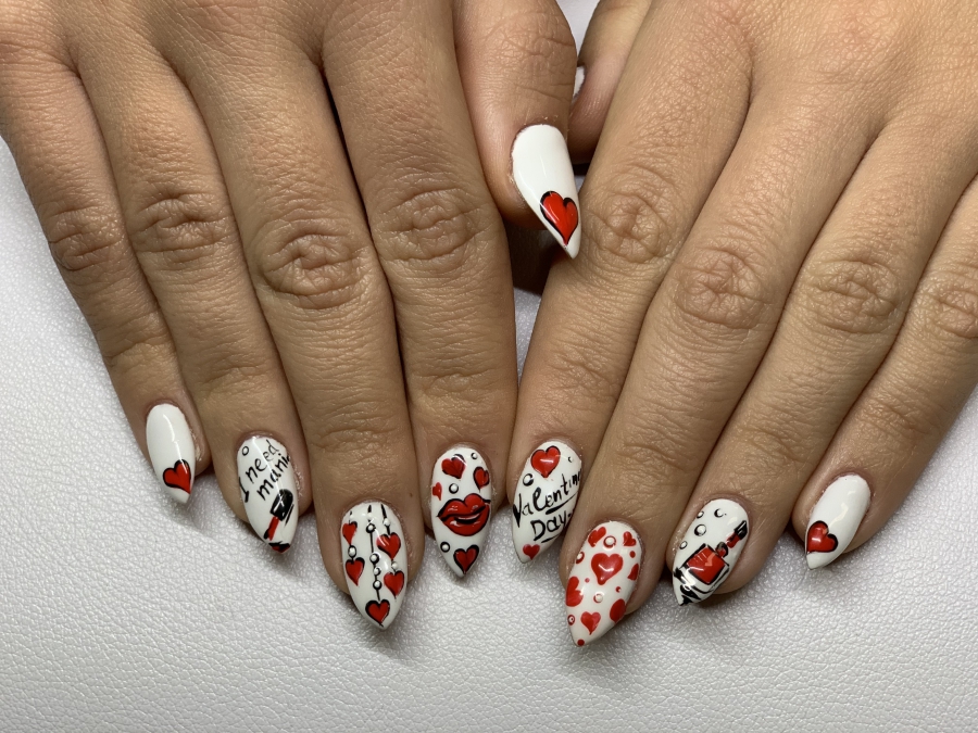 А на по-смелите дами предлагаме да трансфорат ноктите си в художествено платно, на което са изрисувани сърца, надписи и любовни послания по случай идния празник. Този арт дизайн е постоянно настоящ и тематичен.