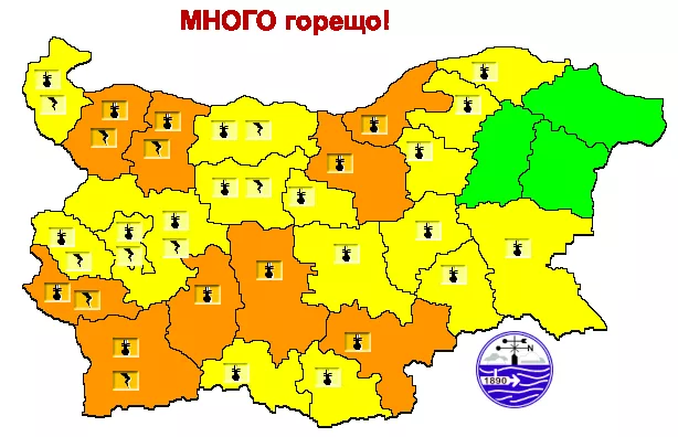 В областите с жълт код температурите ще доближат до 38 градуса. В Западна и елементи от Централна България има разгласен жълт код за следобедни гръмотевични стихии и градушки. Количествата на преваляванията ще са до 30 литра на квадратен метър.