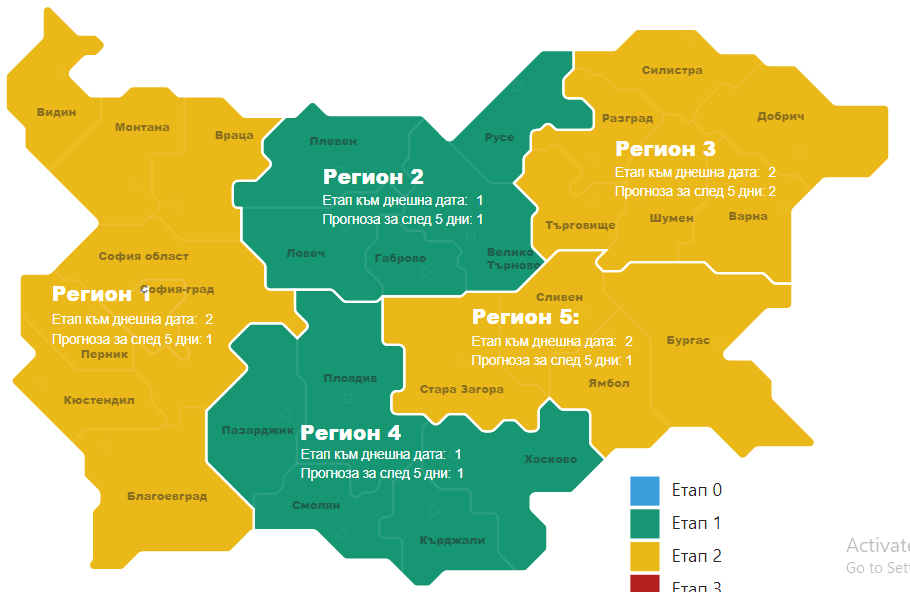 Същевременно още пет области навлязоха в Етап 1 на пандемията, съгласно картата, която регистрира заетостта на интензивните кревати в страната. Това е клъстерът, който обгръща Плевен, Ловеч, Габрово, Русе и Велико Търново. Очаква се тази седмица в зелено ще се оцветят районът, обхващащ София град, София област, Перник, Кюстендил, Благоевград, Враца, Монтана, Видин, както и този с Бургас, Сливен, Ямбол и Стара Загора.