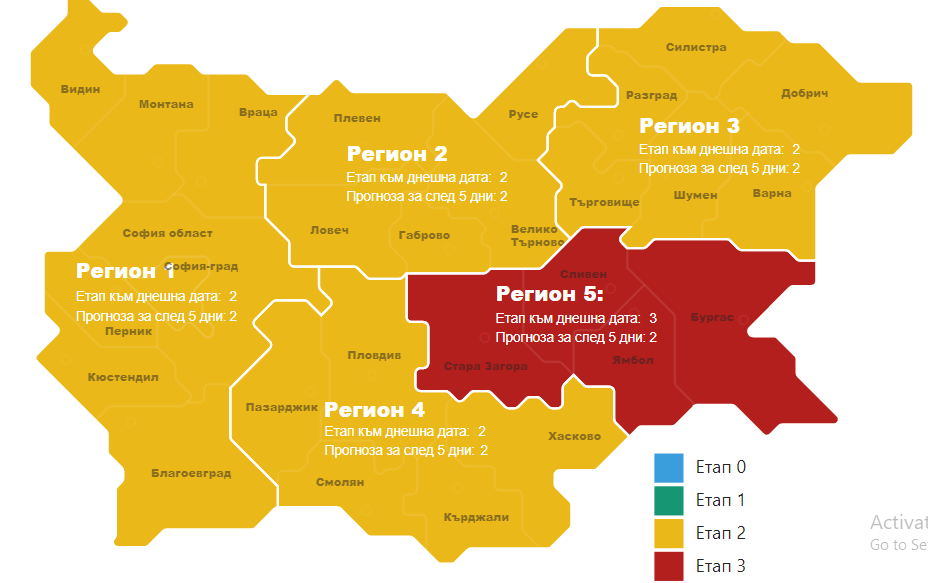 Междувременно още шест области влязоха във втори стадий на пандемията съгласно картата, която регистрира заетостта на интензивните кревати. Става дума за Регион 3, който включва Силистра, Разград, Добрич, Търговище, Шумен и Варна. Така от петте региона, на които е разграничена страната, единствено един към момента е в Етап 3. Това е клъстерът, в който попадат Бургас, Ямбол, Сливен и Стара Загора. Прогнозата обаче е, че още тази седмица и той ще се оцвети в жълто.
