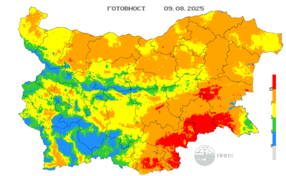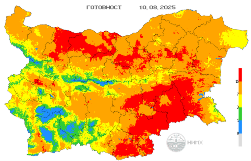 Задава  се  опасност  от  пожари  през  уикенда . На  9 и 10 август  части от страната са оцветени в  алено , което значи, че има  заплаха от доста мощни пожари,  предупредиха от Национален институт по метеорология и хидрология.