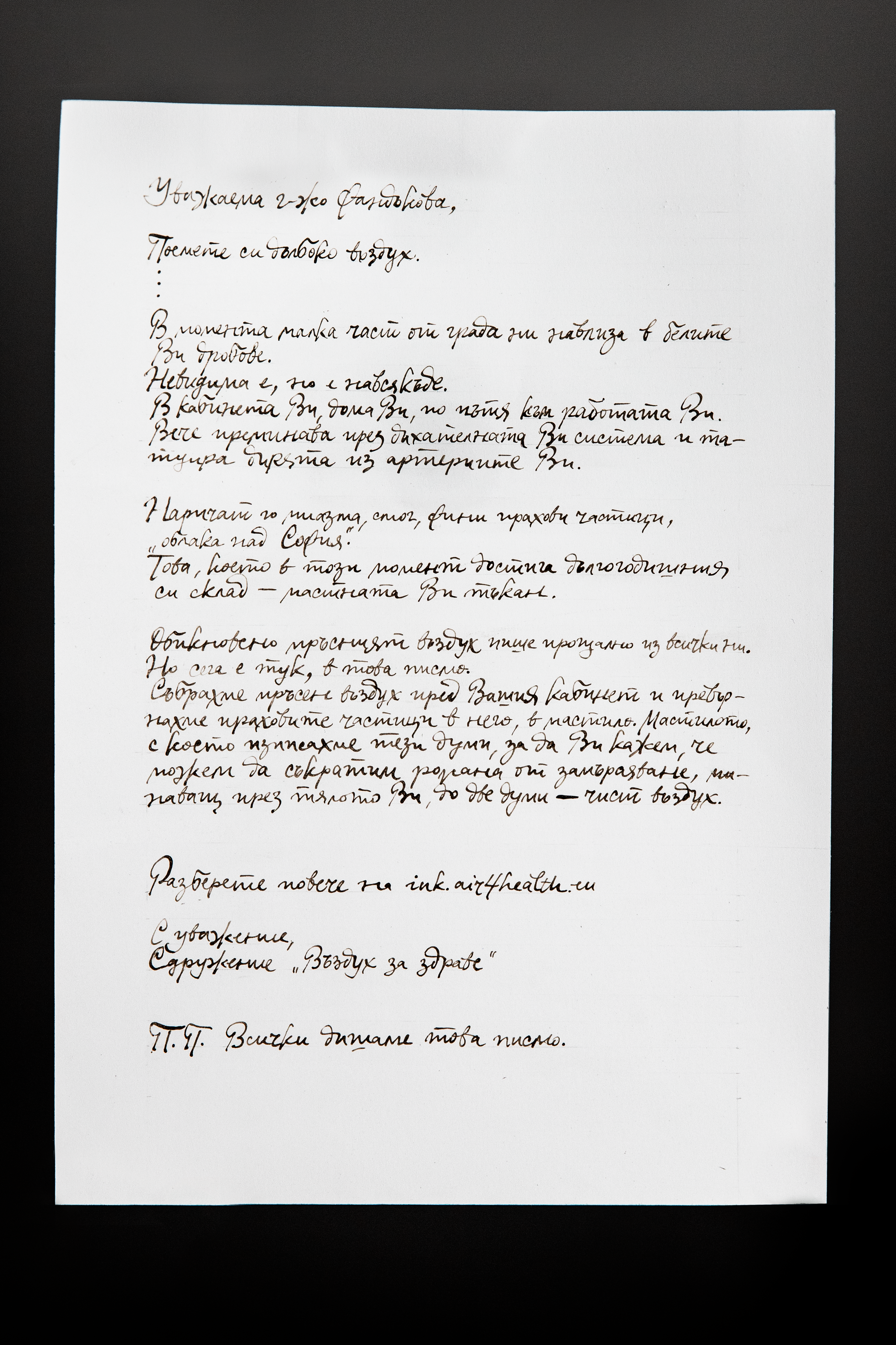 Този зов произтича от самото правене на писмото, тъй като мастилото, с което е написано, е било особено направено от експерт-технолог, ползвайки като съставки съществени замърсители на въздуха в България.