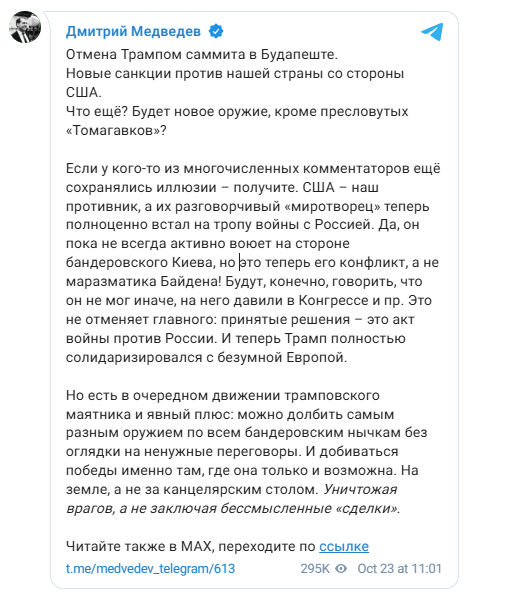 Медведев също уточни очевидно преимущество в актуалната обстановка. Той написа, че към този момент е допустимо да се нанасят удари по украинските сили с огромно многообразие от оръжия. Според него това разрешава да се реализира победа на бойното поле, посредством заличаване на врагове, а не посредством подписване на безсмислени покупко-продажби на масата за договаряния.