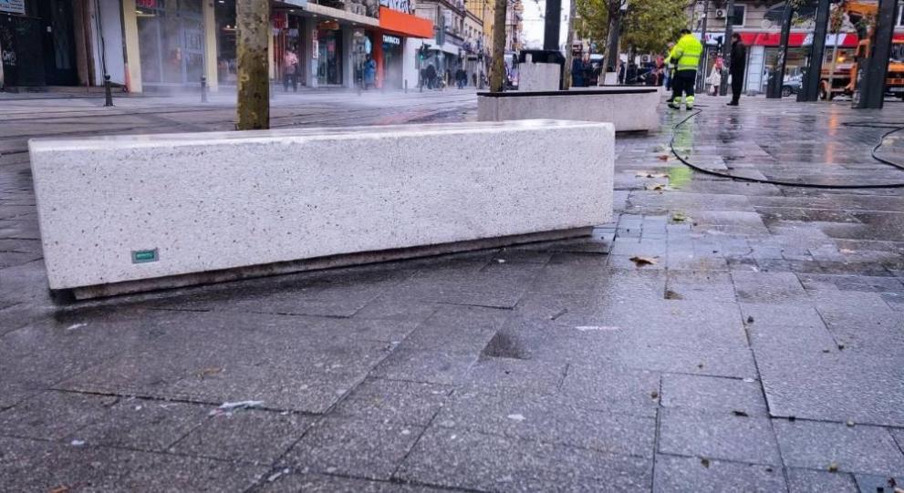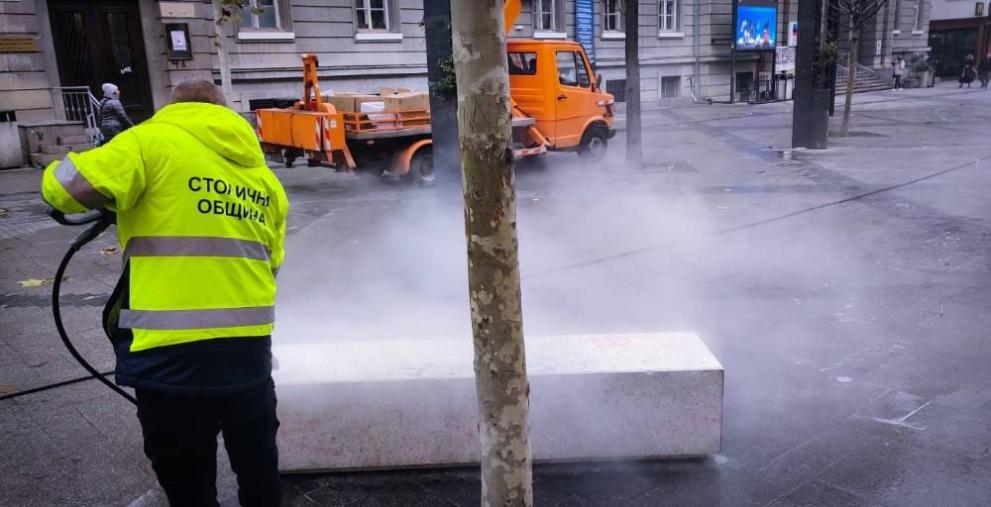 Екипите на Дирекция " Аварийна помощ и предварителна защита " почистват надрасканите пейки , кошчета и перголи с пароструйка. Премахват се лепенки, разгласи и пропагандни материали . Фонтанът на площада се почиства.