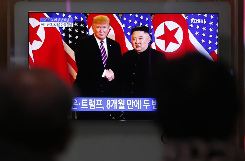 Застанали пред знамената на двете страни, американският президент Доналд Тръмп и севернокорейският водач Ким Чен-ун си стихнаха ръцете.