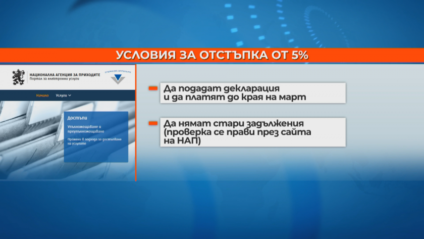 Условията за тази отстъпка остават непроменени - би трябвало да подадете декларацията и да платите до края на март, както и да нямате остарели отговорности. Това може да се ревизира на уеб страницата на Национална агенция за приходите.