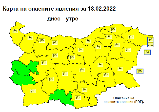 Предупреждение за мощен вятър през днешния ден е в действие в съвсем цялата страна. Очакват се пориви до 22м/сек.