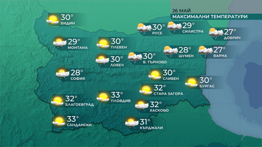 Затоплянето през днешния ден ще продължи и оптималните температури ще са сред 28° и 33°.