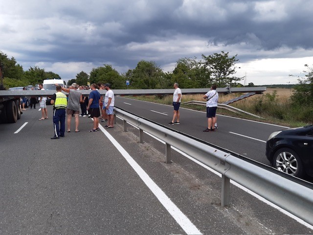 Машината се е движила в посока Бургас, когато закача и демонтира защитната рамка преди пътен възел Крайморие. Рамката е паднала върху четирите платна, оповестиха от Областната дирекция на Министерство на вътрешните работи в Бургас. От там осведомиха за тапи от коли в двете направления.