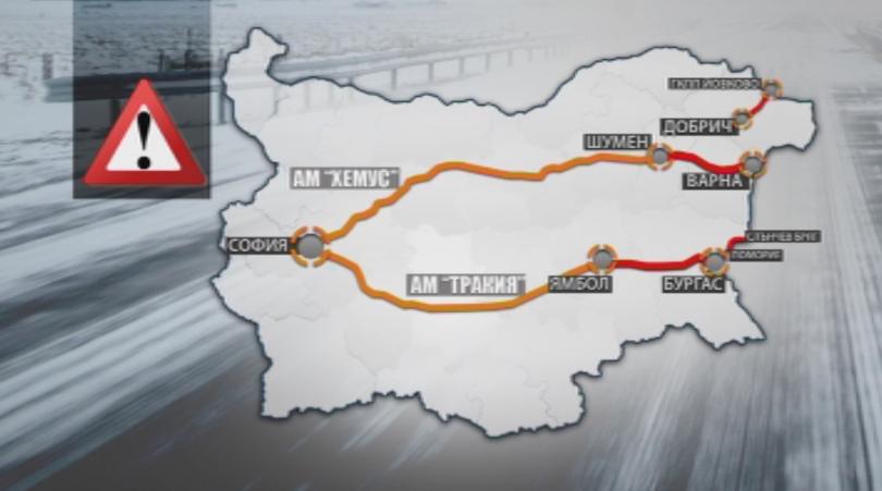 Затворена за придвижване е автомагистрала " Хемус " във Варненско и в двете направления. Ограничения има и по " Тракия " в сектора Ямбол Бургас. В Добричко са затворени всички пътища от републиканската пътна мрежа. Засега единственият пристъпен при тежки зимни условия е пътят от Добрич за Варна.