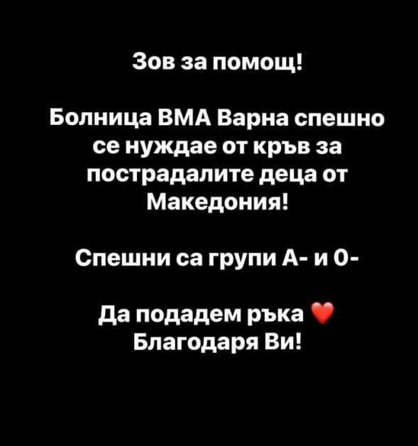 Здравейте, аз съм Михаела и съм жител на Кочани, Северна Македония, само че от 2018 пребивавам и работя в Бургас. Младежи от Кочани са настенени в болница във Варна и имат незабавна потребност от кръв. За тях могат да подаряват единствено А- и 0-. Моля тези от вас, които сте във Варна и имате опция, да дарите кръв за моите съграждани. Благодаря Ви!