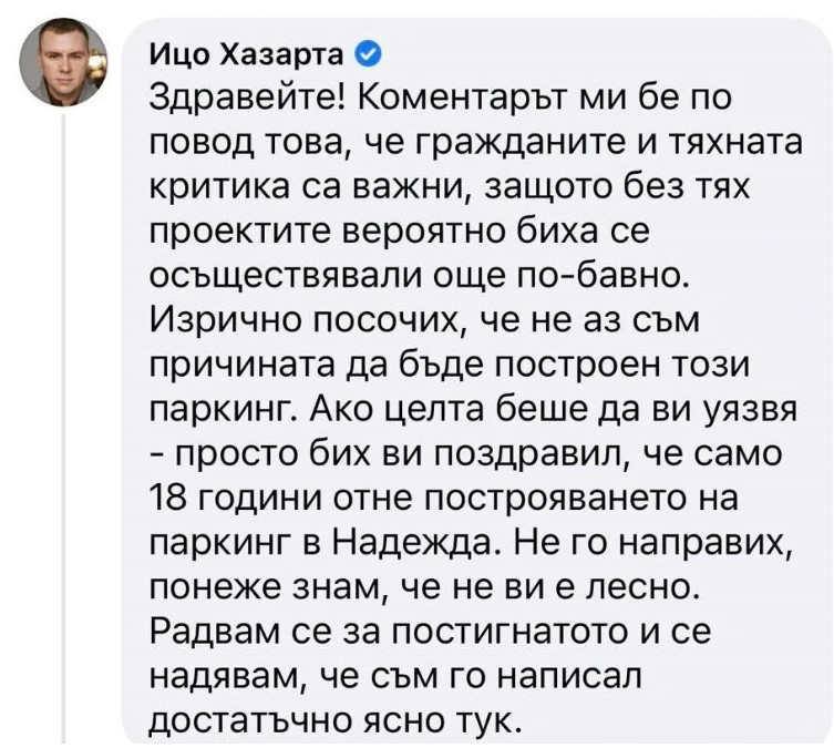 „ Здравейте! Коментарът ми бе във връзка това, че жителите и тяхната рецензия са значими, тъй като без тях плановете евентуално биха се осъществявали още по-бавно. Изрично показах, че не аз съм повода да бъде издигнат този паркинг. Ако задачата беше да ви уязвя - просто бих ви поздравил, че единствено 18 години лиши построяването на паркинг в Надежда. Не го направих, тъй като знам, че не ви е елементарно. Радвам се за постигнатото и се надявам, че съм го написал задоволително ясно тук ”. Това гласи коментар на претендента за депутат от „ Продължаваме промяната ” Ицо Хазарта под пост на ръководителя на Столичния общински съвет Георги Георгиев.