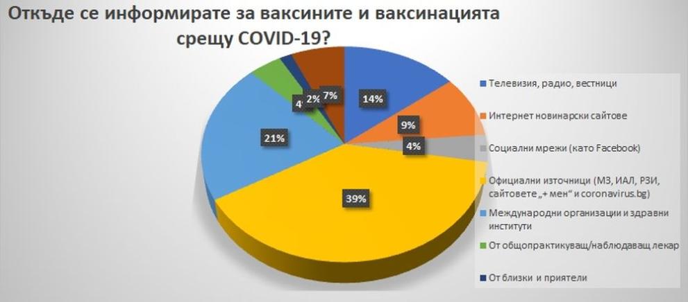 Министерство на здравеопазването 21% от гласувалите означават, че информация за имунизациите и имунизацията против COVID-19 получават от интернационалните организации и здравни институти, 14% – от малкия екран, радиото и вестниците, 9% – от интернет новинарски уеб сайтове. Най-нисък е процентът на жителите, които показват като източници на информация общопрактикуващ или наблюдаващ доктор , и близки и другари – надлежно 4% и 2%. В анкетата са се присъединили 195 души.