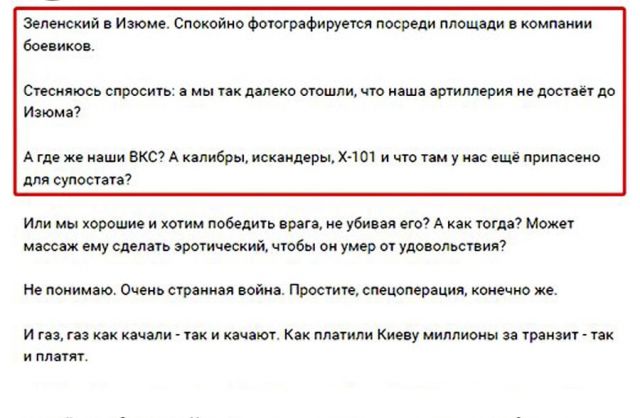 „ Зеленски в Изюм е пестник за всички генерали на Руската федерация. Как по този начин, по дяволите, те умерено се разхождат и висшият команден състав, и висшият главнокомандващ?! Къде е нашата авиация?! Къде са ни калибрите?! Какво, по дяволите, се случва?!
