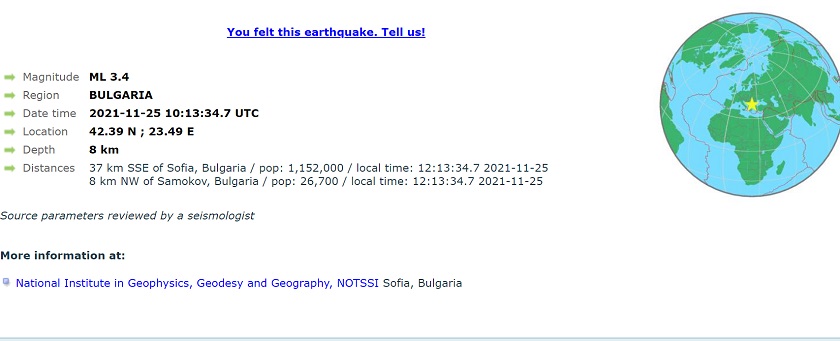 Според Националния институт по геофизика, геодезия и география трусът е бил в 12.13 часа и е с магнитуд 3,6 по Рихтер и дълбочина 15 км.