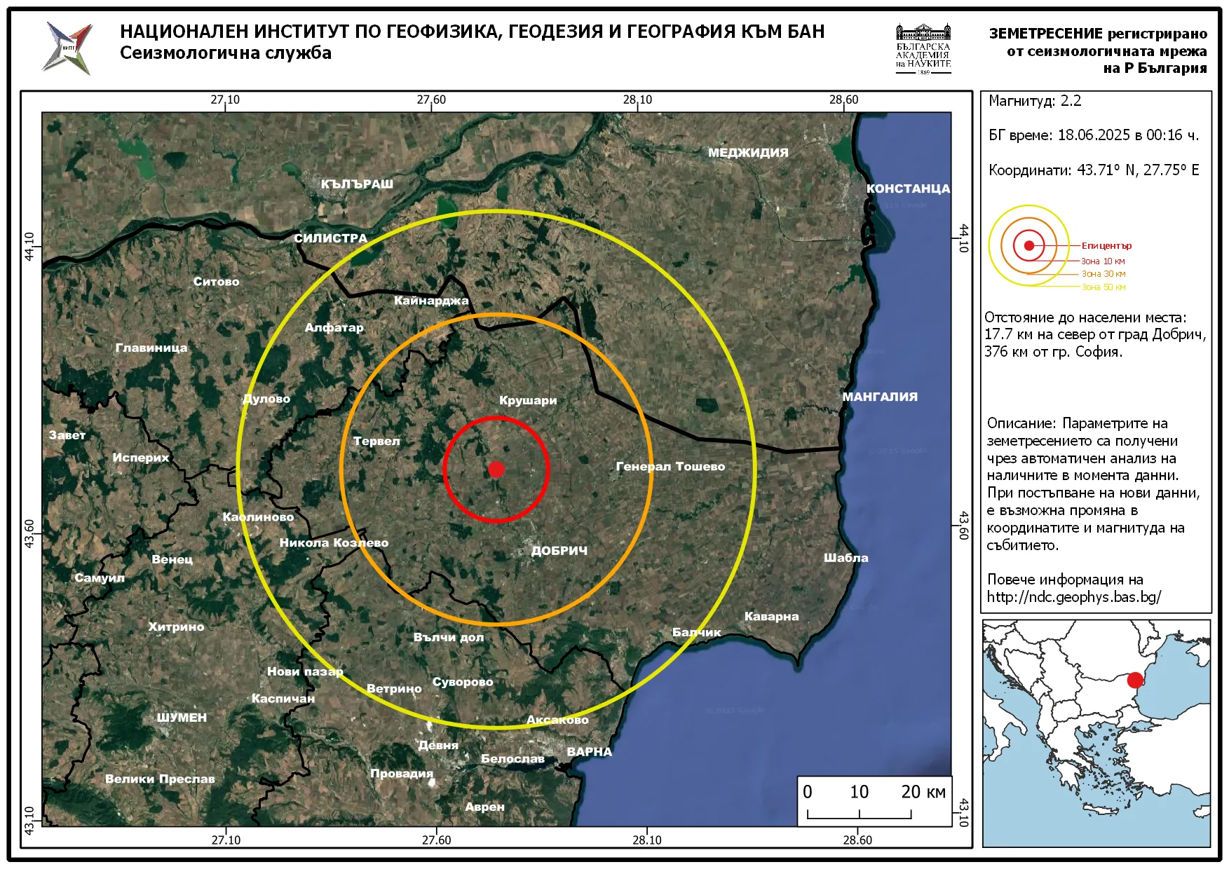 Земетресение е записано малко след среднощ – в 00:16 ч. българско време у нас. Трусът е бил с магнитуд 2.2 в региона на Североизточна България, край Добрич.