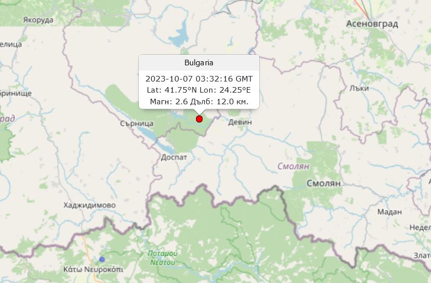 Трусът с магнитуд от 2,6 по скалата на Рихтер е регистрирано на 10 километра от родопския град Девин (61 км югозападно от Пловдив).