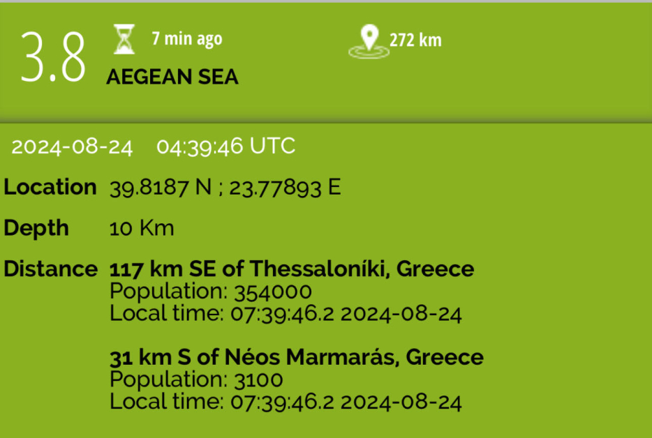 Земетресение е записано тази заран в Егейско море. Според данни от сеизмологичните служби трусът е с магнитуд от 3.8 по скалата на Рихтер, на 117 км югоизточно от Солун, вторият по величина град в Гърция, и на 31 км южно от крайбрежното населено място Неос Мармарас.