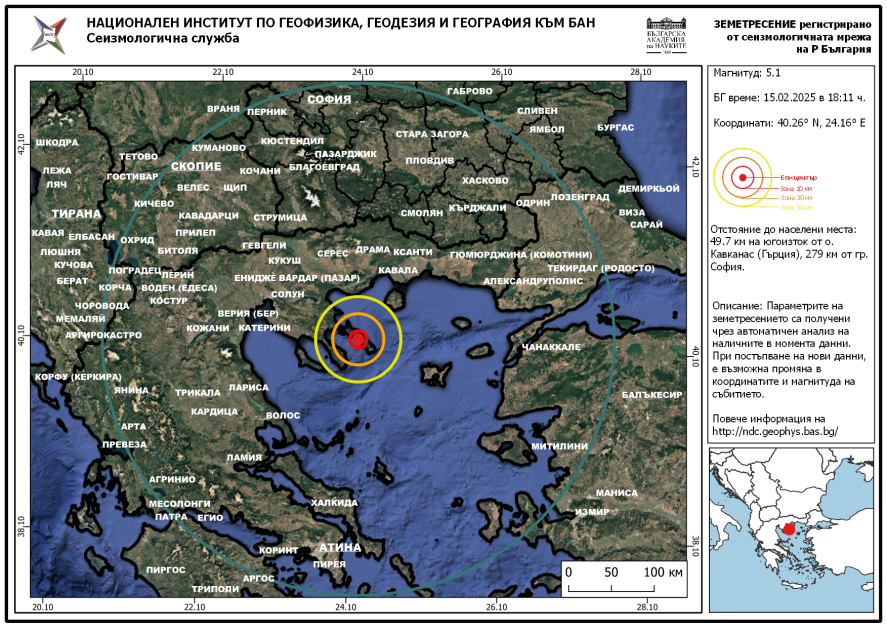 Земетресение е записано в региона на Егейско море, на 30 км от гръцки остров Кавканас, оповестява Институтът по геофизика към Българска академия на науките. Магнитудът, който те са отчели, е 5.1 по скалата на Рихтер. По данни на европейско-средиземноморски сеизмологичен център силата на труса е била 4.9 по Рихтер.