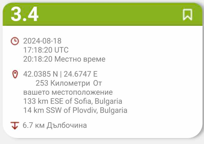 Земетресение е усетено в Пловдив. Магнитудът му е 3,4 по скалата на Рихтер. Епицентърът е на към 15 км. от Пловдив - с. Извор, община Родопи.