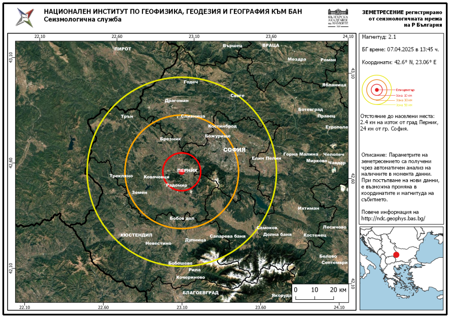 Земетресение от 2,1 по Рихтер е записано в Перник. Това сочат данните на Геофизичния институт на Българска академия на науките.