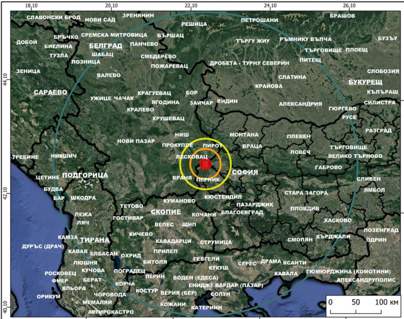 Трусът е регистриран на 57 километра от София, на територията на Сърбия. Той е бил с дълбочина от 20 километра, на юг от град Пирот.