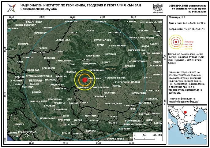 Земетресение от 4,3по Рихтер е записано в окръг Горж, Румъния, сочат данните на Геофизичния институт към Българска академия на науките.