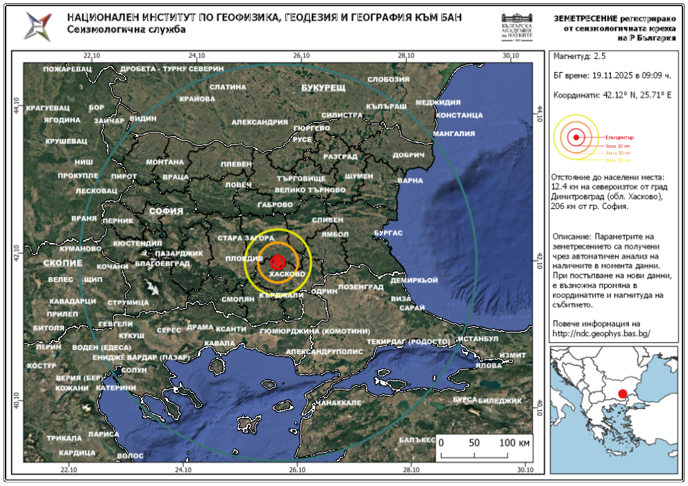 Трусът е усетен в 09:09 ч. тази сутрин североизточно от Димитровград, югозападно от Гълъбово. Епицентърът му е на дълбочина от 15 км.