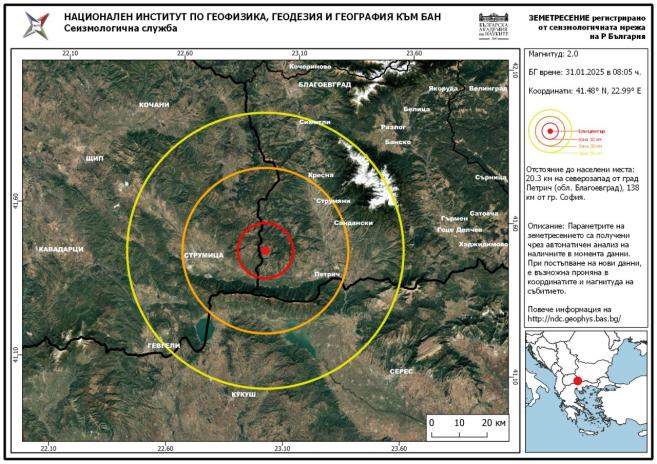 З еметресение с магнитуд 2.0 по скалата на Рихтер е записано в 8:05 ч. тази заран у нас . Това сочат данните на Националния сеизмологичен център към Националния институт по геофизика, геодезия и география - Българска академия на науките.
