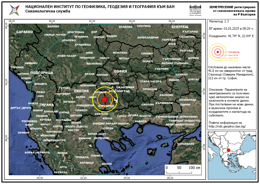 Земетресение с магнитуд 2.3 по Скалата на Рихтер е станало в 8:29 часа на 1 януари. Епицентърът е на територията на Република Северна Македония, в непосредствена непосредственост до границата с България.