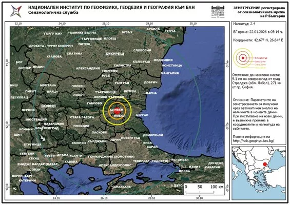 Земетресение с магнитуд 2,4 по скалата на Рихтер е имало край Стралджа тази заран в 5:14 часа. Това излиза наяве от данни на Националния институт по геофизика, геодезия и география към Българска академия на науките.