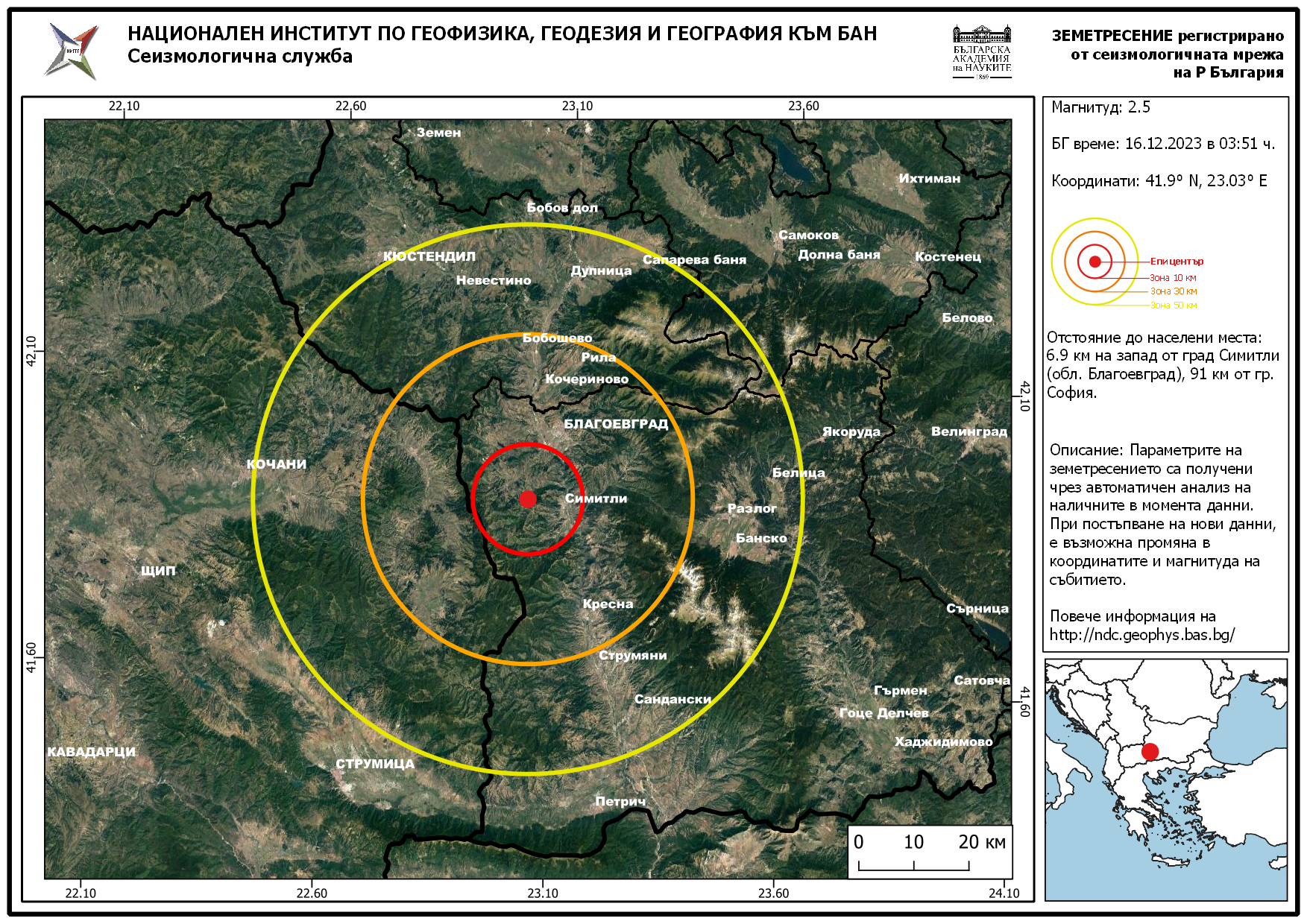 Земетресение с магнитуд 2.5 по Рихтер е записано в 3:51 часа в региона на Симитли. Това регистрира Националния институт по геофизика, геодезия и география към Българска академия на науките.